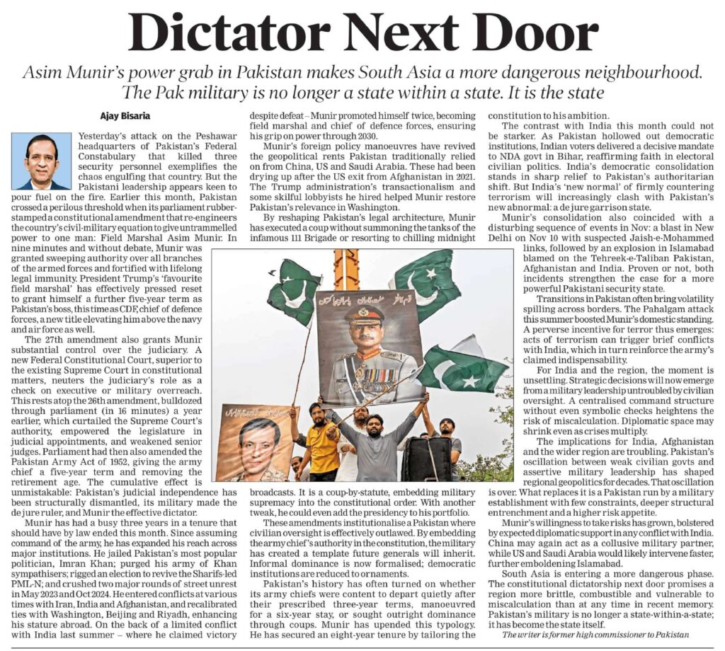 Asim Munir’s power grab in Pakistan makes South Asia a more dangerous neighbourhood. The Pak military is no longer a state within a state. It is the state Yesterday’s attack on the Peshawar headquarters of Pakistan’s Federal Constabulary that killed three security personnel exemplifies the chaos engulfing that country. But the Pakistani leadership appears keen […]