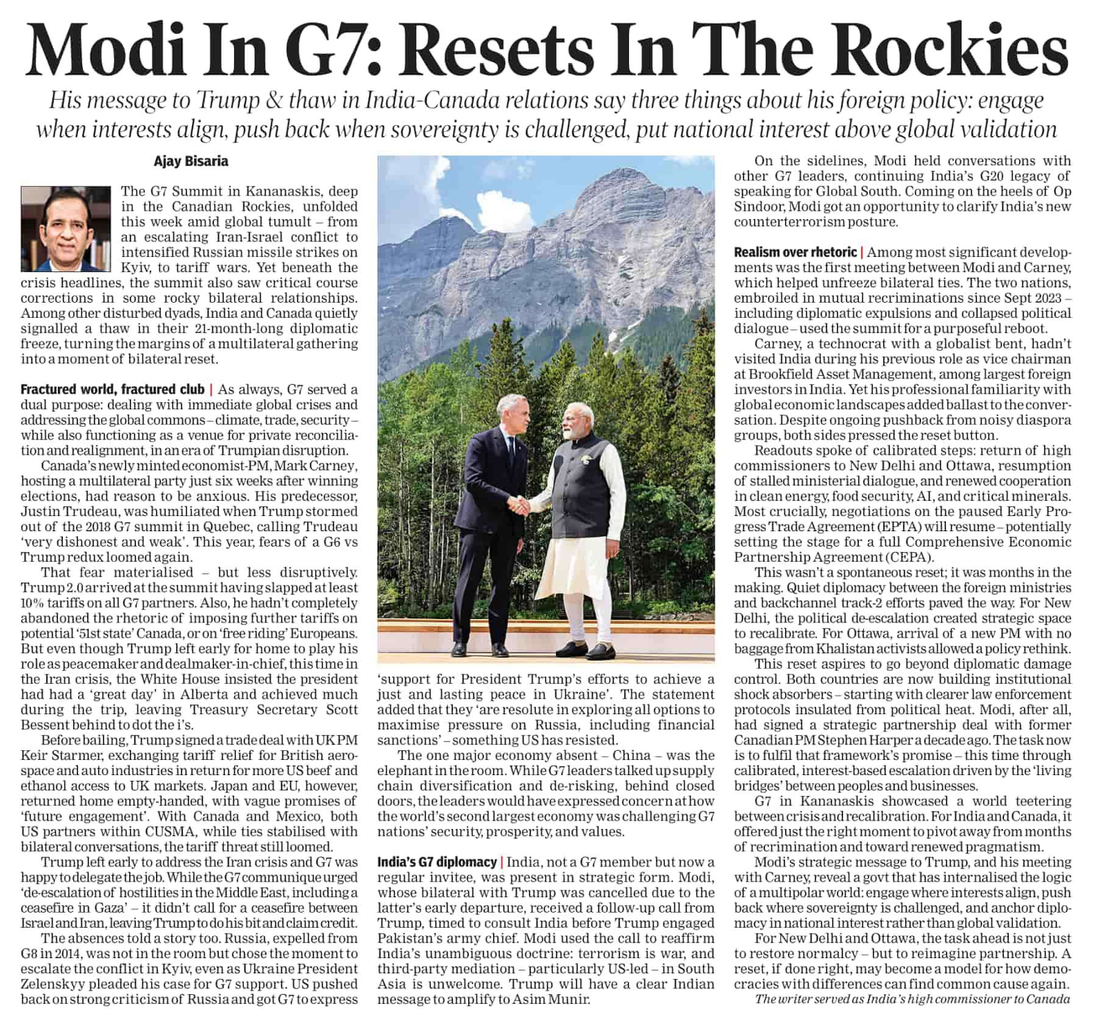 Realism over rhetoric | Among most significant developments was the first meeting between Modi and Carney, which helped unfreeze bilateral ties. The two nations, embroiled in mutual recriminations since Sept 2023 – including diplomatic expulsions and collapsed political dialogue- used the summit for a purposeful reboot.